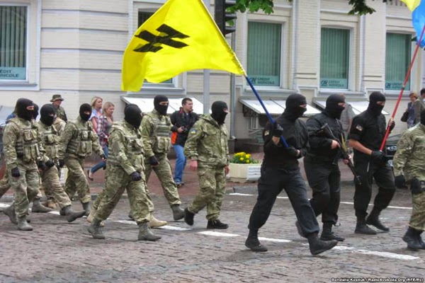 A képen Kijev-régió rendőrparancsnoka, Vadim Troyan látható, az Azov zászlóalj egyik vezetője >>>